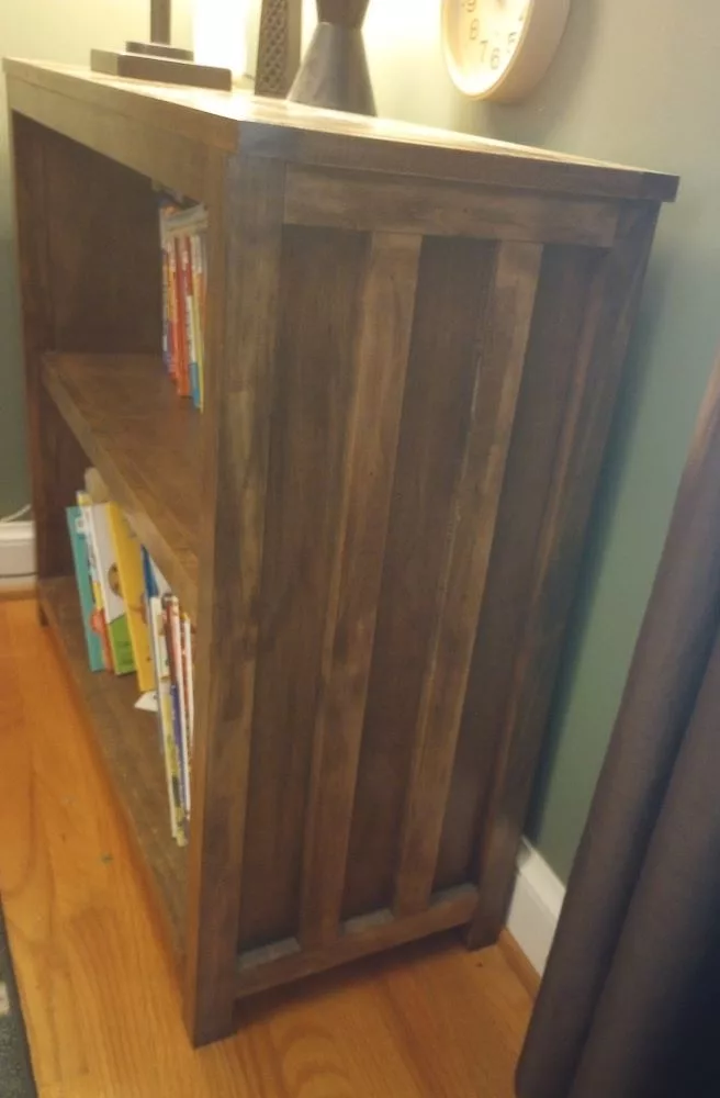 When we were expecting our 4th child, it became time to convert our den (a.k.a. man cave) to a bedroom for our son. We did not have it in our budget to purchase new bedroom furniture and our search for quality dressers made out of real wood proved fruitless. I decided to make a dresser and a bookshelf to match my childhood bunkbeds, which we would use once our son outgrew the toddler bed. After we returned home from the hospital with our daughter, Naomi, I went to work building the dresser, which has 4 drawers a shelf underneath to fit baskets for his toys and other miscellaneous items. Once completed, I build a small bookshelf to hold all of the children’s picture books. We chose Early American stain to match my childhood furniture.